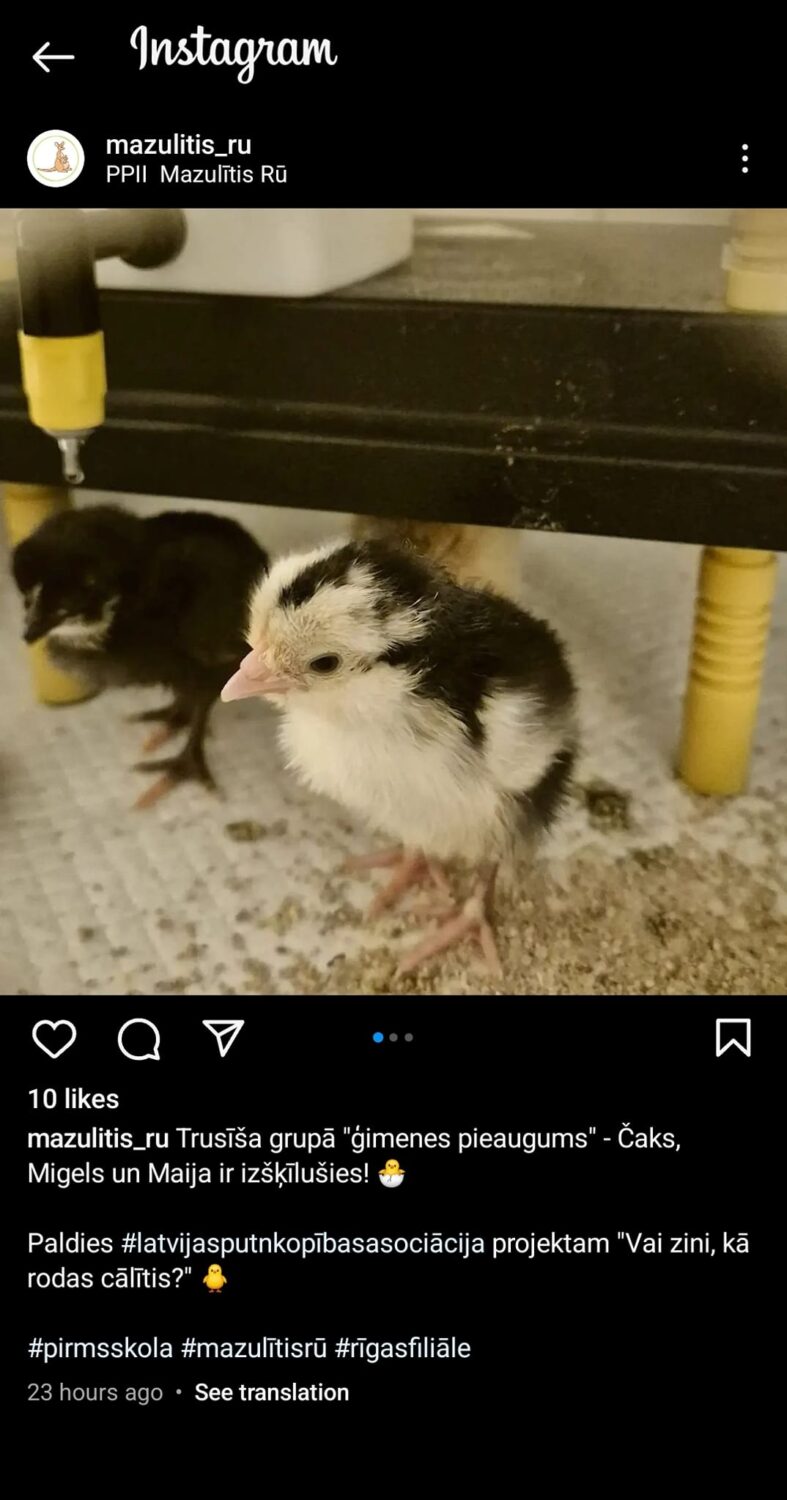 Saulkrastu novada Sējas pagasta PII Bitīte Pabažu filiāle, 2024. gada maijs Realizēts 2 cāļi no 3 olām